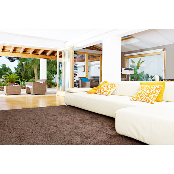 Because you have the space to play with, keep sofas off the rugs (butt the legs up against the edge of the rug instead). If you choose to place all of the furniture on top of your rugs, it will draw the space in and make it feel smaller.